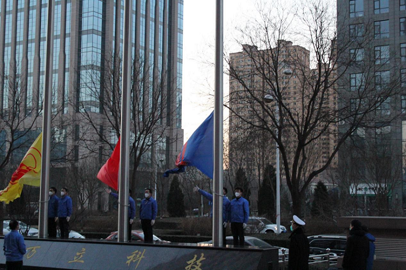 隨著(zhù)《義勇軍進(jìn)行曲》的響起,三面旗幟伴著(zhù)太陽(yáng)一同升起,全體員工懷著(zhù)激動(dòng)的心情向國旗行注目禮。